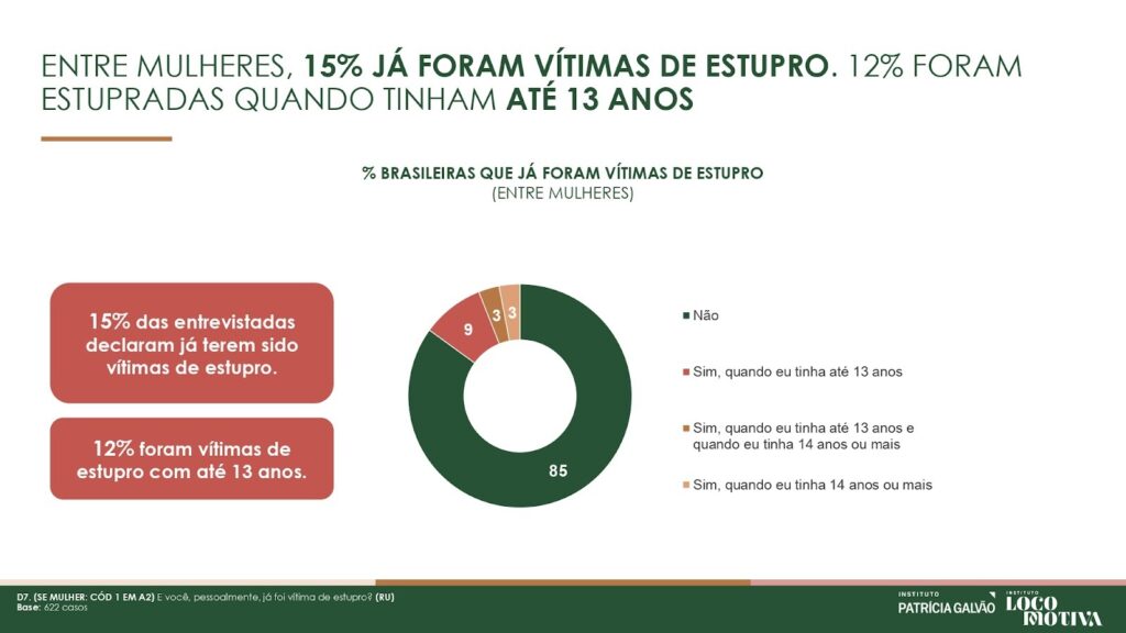 A violência é mais próxima da realidade dos brasileiros do que se imagina. Dois em cada três entrevistados (66%) dizem conhecer uma mulher ou menina que já foi vítima de estupro. Entre as próprias mulheres, 15% afirmam já ter sido vítimas ao longo da vida, e 12% relatam que a violência ocorreu quando tinham até 13 anos de idade.