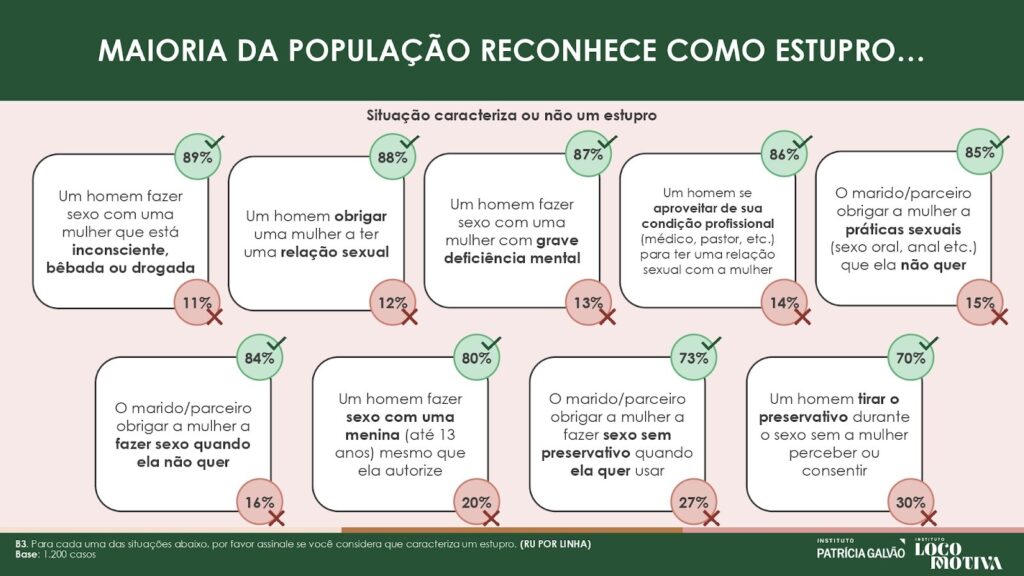 Ainda assim, o entendimento sobre o que configura estupro permanece incompleto: apenas 57% conseguem identificar corretamente todas as situações que caracterizam o crime, incluindo casos de estupro conjugal.