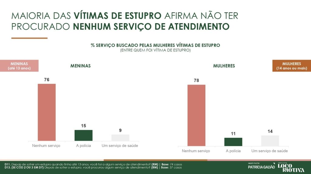 Os dados também mostram que 76% das vítimas de estupro até os 13 anos não buscaram qualquer tipo de serviço de apoio e, entre as que tinham 14 anos ou mais, 78% não recorreram a delegacias ou unidades de saúde. Entre as justificativas citadas estão ameaças do agressor (58%), medo de não serem acreditadas (43%) e vergonha (33%).