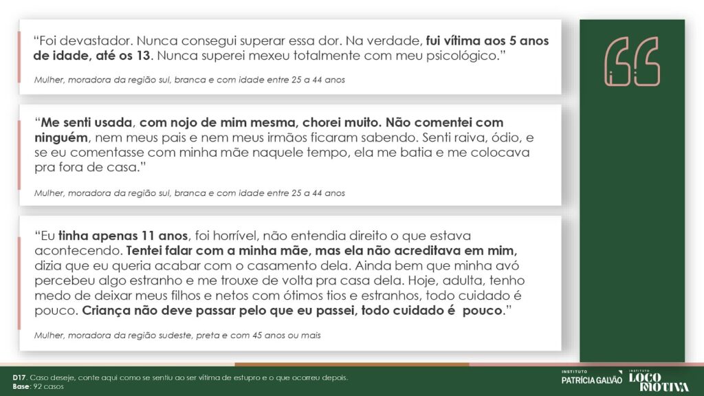 Depoimentos de mulheres que viveram a violência reforçam o impacto psicológico e social do trauma. Uma entrevistada do Nordeste, atualmente com mais de 45 anos, relatou ter sofrido abuso por familiares ainda na infância e não ter buscado ajuda por medo e culpa. Outra vítima, também nordestina, contou ter realizado aborto clandestino aos 13 anos após engravidar em decorrência do estupro, encontrando apoio apenas em uma amiga próxima.