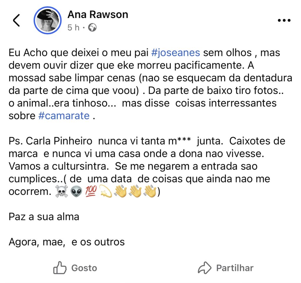 Ao longo da tarde de segunda-feira, Ana Anes fez vários posts com uma descrição dos seus atos. Numa delas, escreveu: “Acho que deixei o meu pai sem olhos. Mas devem ouvir dizer que morreu pacificamente. A Mossad sabe limpar cenas.”.