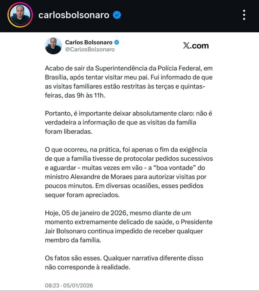 Carlos Bolsonaro ressaltou ainda que, mesmo após a alta hospitalar de Jair Bolsonaro, concedida em 1º de janeiro de 2026, o ex-presidente continua impedido de receber qualquer membro da família fora dos dias e horários estabelecidos.