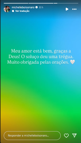 “Meu amor está bem, graças a Deus! O soluço deu uma trégua. Muito obrigada pelas orações!”, escreveu Michelle em uma publicação no Instagram, acrescentando uma mensagem de gratidão aos seguidores.