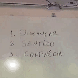 Em determinado momento, uma pessoa próxima à porta da sala chama a atenção do policial para os erros. Inicialmente, o agente corrige apenas a grafia da palavra “descansar”. Em seguida, após nova advertência, ele retorna à lousa e reescreve “continência”, desta vez incluindo a letra “n”.
